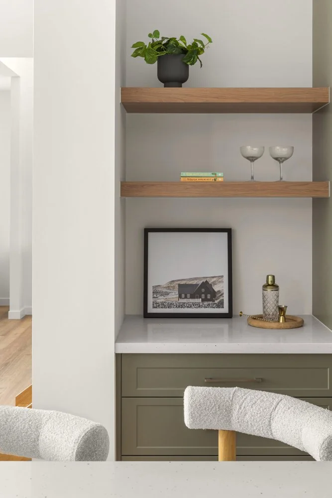 Decorative shelf arrangement with a potted plant, books, two glass candle holders, a black-framed photograph of a house, and a decorative bottle on a tray, set against a light gray wall.